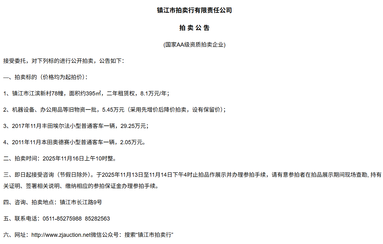 本公司受鎮(zhèn)江市公安局委托,對2025年度鎮(zhèn)江市市區(qū)摩托車上牌額度認購權(quán)進行拍賣,現(xiàn)將有關(guān)事項公告如下: